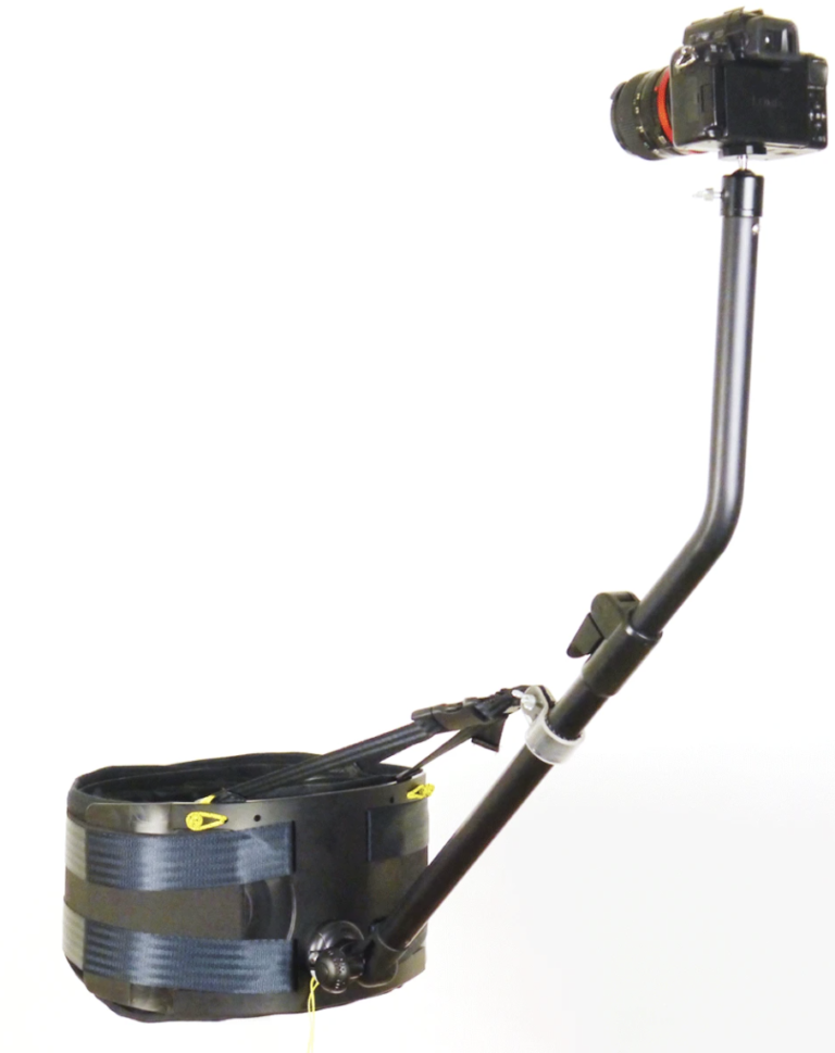 • La fixation dorsale permet de soutenir le bras caméra de huit façons différentes. Vous pourrez donc installer la caméra au dessus, au niveau de l’épaule droite ou gauche ou encore à l’horizontale sur le coté droit ou gauche du porteur. La rotule située au bout du bras permettra d’ajuster précisément l’orientation de la caméra afin d’obtenir le cadrage parfait.